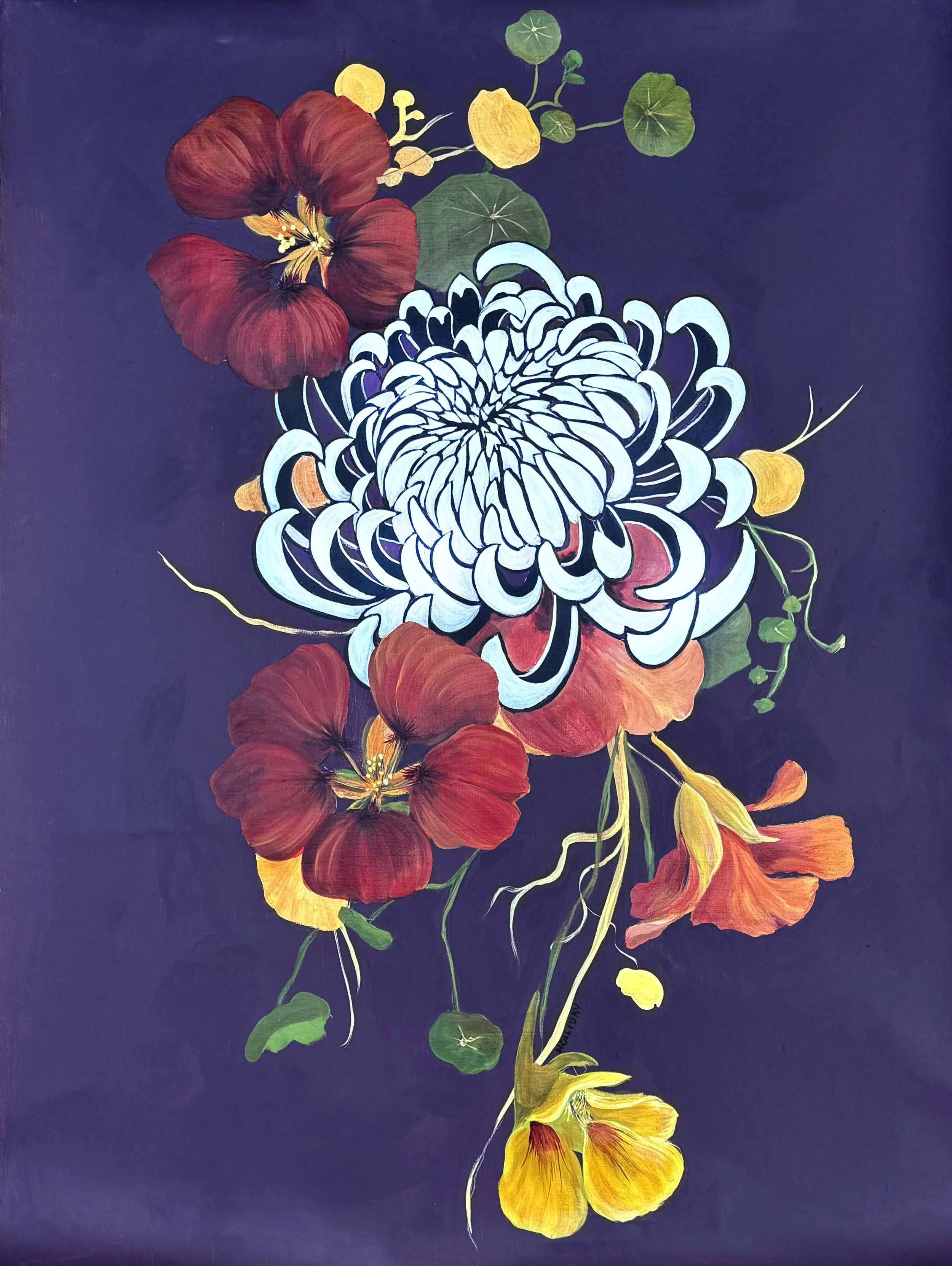 My work seems like happy generic flower paintings but dig deeper and you will find it is full of meaning. Nasturtiums symbolize a Mother's love. Chrysanthemums symbolize condolences. This piece is about a sorrow that is cradled in care. You see the stark pedals of the Chrysanthemum curling inward and the Nasturtiums surrounding the sorrow on all sides. The nasturtiums are protective and sheltering. The dark background gives way for reflection, mourning and comfort. My paintings always reflect what I'm going through in symbolic forms. I am missing my mother right now as I navigate difficult times. The painting often reflects what I wish was happening. Flowers are my subjects to help me tell the stories.