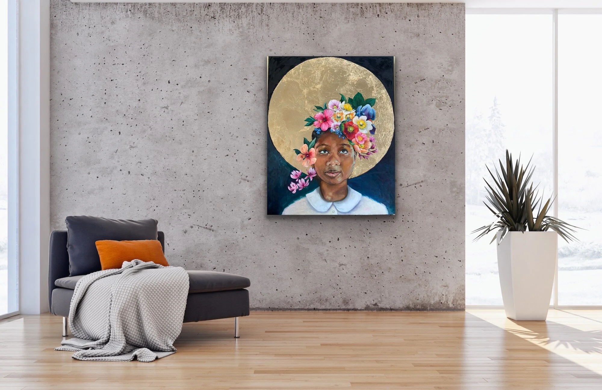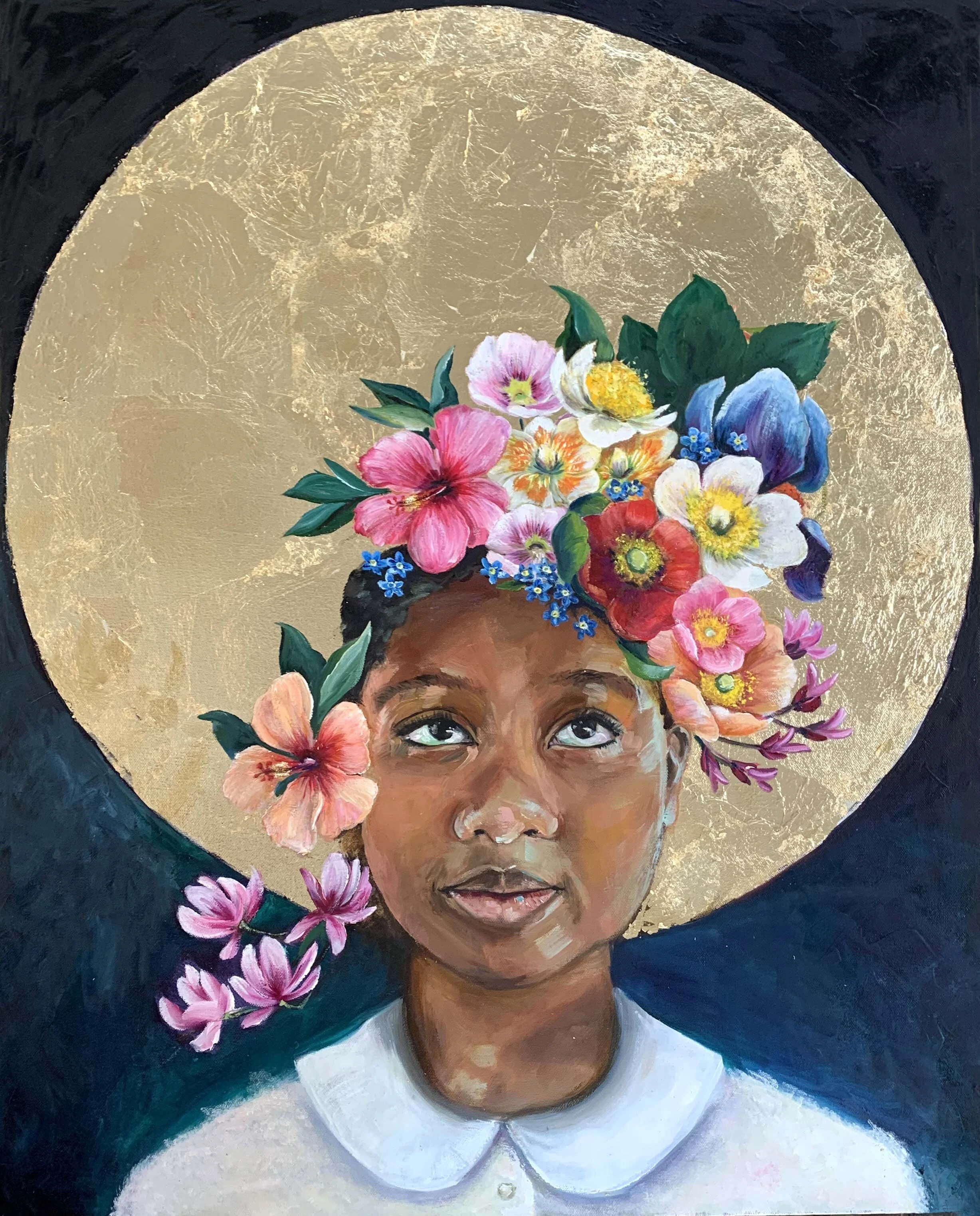 Flower symbolism: Iris: A message for you, Hibiscus: Change, Tulip Poplar Tree flower: Courage, Magnolia: Dignity and Perseverance, and Marianthus: Hope for better days.